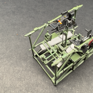 At this point I attached to the cage the pilot seat, rudder pedals, seat back plate and the back rib. Then I took care of the back and head armour plate - first I attached belts and then a small part in front of it. Then I attached reflector site to the canopy rail with CA glue. Next I applied chipping to the canopy rail using Medium Gunship Grey and a small brush, next using same color I added more chips with the sponge. Next using off white color I dot painted rivets and then glued back and head armor to the canopy rail and protected everything with layer of Hataka satin clear XP08. As last step I used Molotw Liquid Chrome to reproduce a mirror which is located at the base of reflector site. Using same off black mix I chipped black consoles including main instrument panel and then applied Blue Grey wash on them. Next whole cage was sprayed with Hataka flat mat XP07.