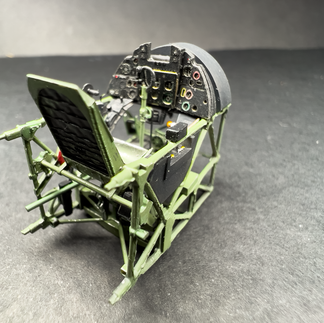 I decided that I want to paint as much as possible with an airbrush to reduce the possibility of flooding really small details with the brush painting - for that to happen first I had to figure out which subcomponents I can combine together now so I have less separate parts for painting. Next I divided everything to two groups. First group received primer coat of Mr. Color 1500 black and then layer of base green gray color. I used back primer so that I could achieve preliminary shading after airbrushing base color. Second group was primed with Mr. Color 1500 grey and then base color layer of off black (mix of MR. Color Black and RAF Sky Grey) was applied. Next I returned to the first group and enhanced shading by application of diluted mix of Grey Green and Black - I concentrated airbrushing that on lower parts of the cockpit frame. There were exceptions to that process though - the most noticeable subassemblies with larger surfaces like pilot seat back plate or pilot seat itself after being primed were painted silver. As soon as it was dry I airbrushed layer of scratches effect and on top of that base color of Grey Green and immediately followed with darker tone to introduce shading. As soon as it was dry to the touch I started chipping the paint by application of water and rubbing the paint with the stiff brush. Another exception were kick plates of the rudder pedals which were painted silver.