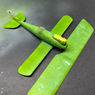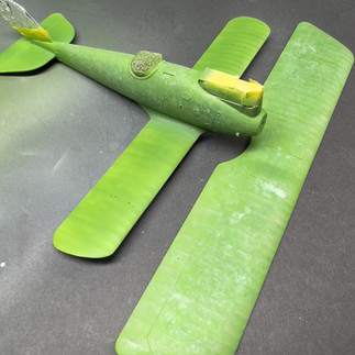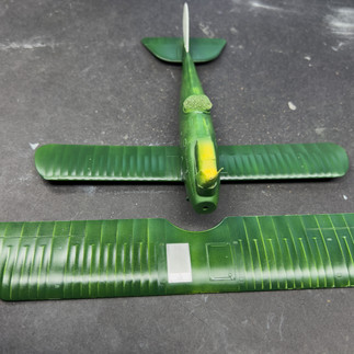 With the Russian Green applied, I used the mottling technique with selected templates and C62 (Flat White) and C319 (Light Green) to add variety. Then, using a sponge and H312 (Green FS34277), I added another layer of interest to the surface. The top surface of the top wing, after masking everything except the ribs, received a layer of H312 (Green FS34277). At this point, I had built a highly varied base, so I followed with the final colour application.